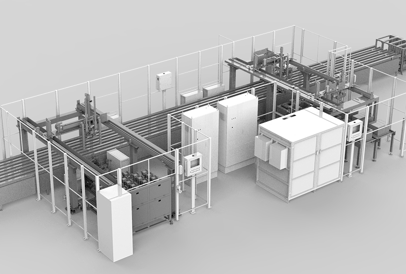 To realize flexible and intelligent assembly and testing of PACK, including automatic housing on-board, automatic module entry, automatic tightening, air tightness test, EOL test, charge and discharge test, intelligent logistics and production line MES.